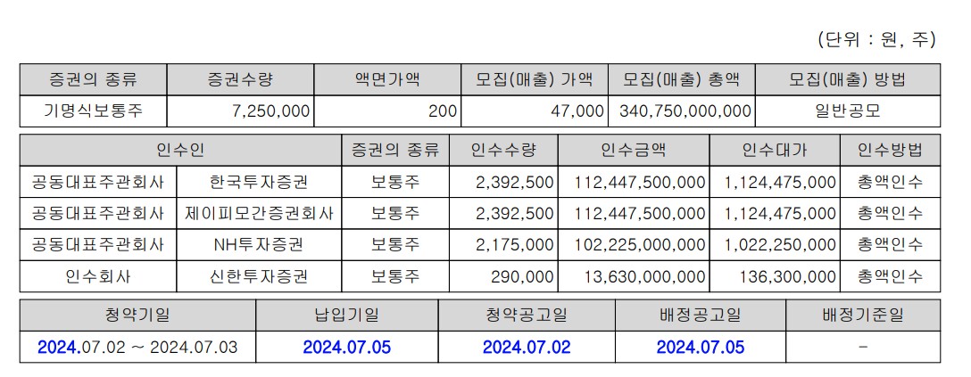 | 상장 주관사 | 한국투자증권, NH투자증권, 제이피모간증권 |