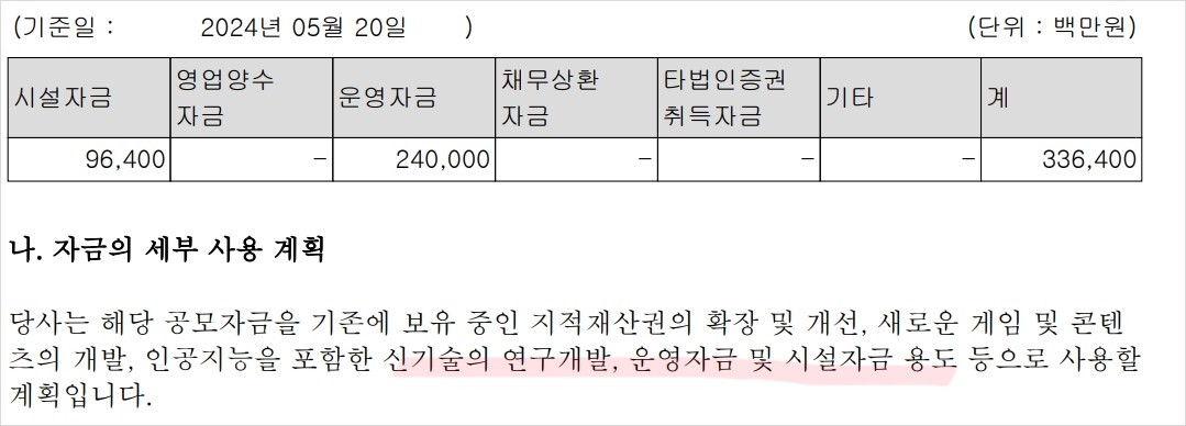 자금 사용목적은 준수함. 채무상환자금이 없고 대부분 시설자금과 운영자금임. 게임사이다보니 시설자금보다는 운영자금에 사용목적이 치우친건 당연한 듯.