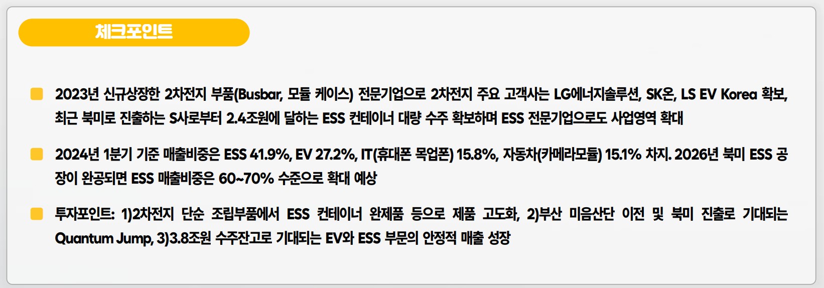 신성에스티는 2023년 신규 상장한 2차전지 부품(Busbar, 모듈 케이스) 전문기업임. 주요 고객사로는 LG에너지솔루션, SK온, LS EV Korea 등이 있으며, 최근 북미로 진출하는 S사로부터 2.4조원에 달하는 ESS 컨테이너 대량 수주를 확보함. 이에 따라 ESS 전문기업으로도 사업영역을 확대함. 2024년 1분기 기준 매출비중은 ESS 41.9%, EV 27.2%, IT 15.8%, 자동차 15.1%를 차지하고 있음. 북미 ESS 공장이 완공되면 ESS 매출비중은 60~70% 수준으로 확대될 것으로 예상됨. 주요 투자포인트는 2차전지 단순 조립부품에서 ESS 컨테이너 완제품 등으로 제품을 고도화하는 점, 부산 미음산단 이전 및 북미 진출로 인한 Quantum Jump, 3.8조원 수주잔고로 기대되는 EV와 ESS 부문의 안정적 매출 성장임.