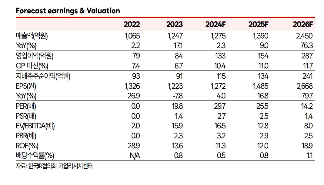 신성에스티의 매출액과 영업이익은 꾸준히 증가하고 있음. 2024년 매출액은 1,275억원, 영업이익은 133억원으로 예상됨. 부채비율은 200% 기준으로 양호한 수준이며, PER은 29.7배로 코스닥 대비 높은 밸류에이션을 형성하고 있음.