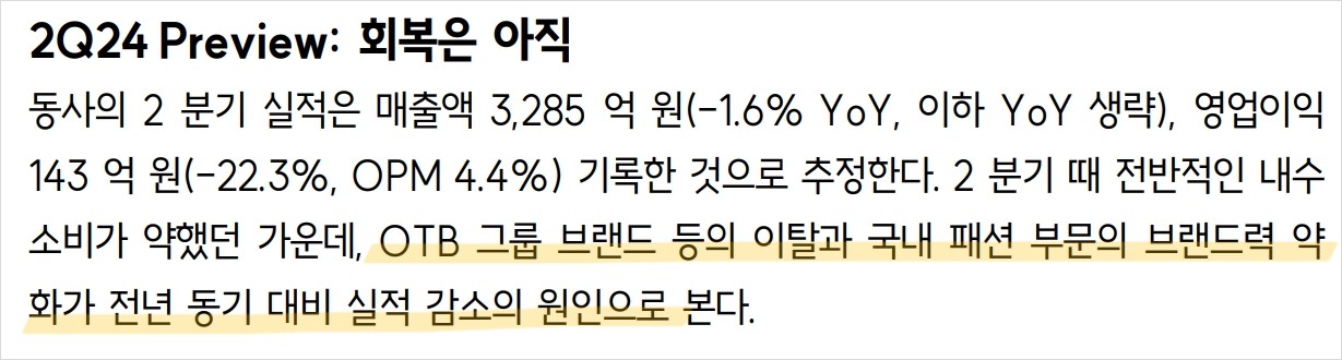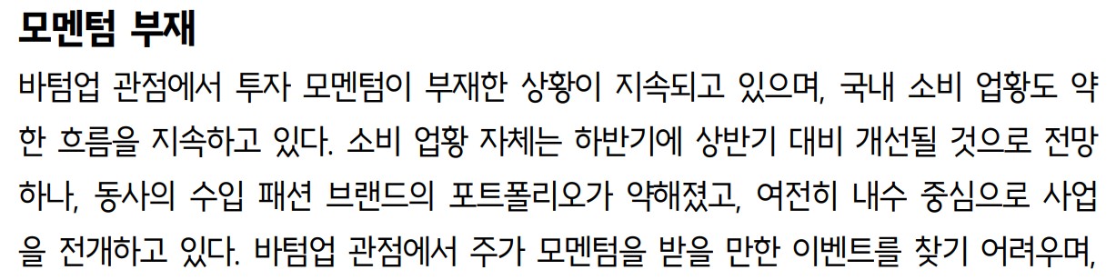 - 기본적 분석: 재무상태 안정적, 패션 부문 약세