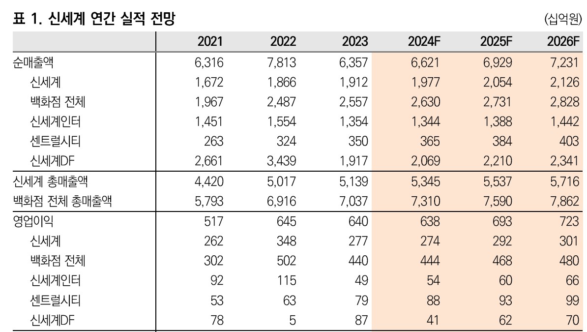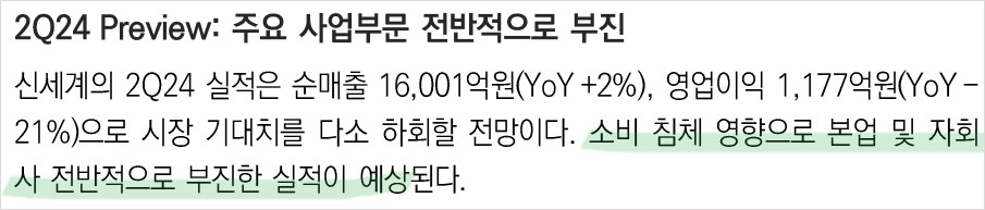 신세계는 2024년 2분기 실적 발표를 앞두고 있으며, 매출액은 1.2조 원, 영업이익은 800억 원을 기록할 것으로 보임. 백화점 부문에서는 고가 브랜드의 매출이 증가하고, 면세점 부문은 해외여행 수요 회복으로 매출이 증가할 전망. 또한, 신세계는 최근 온라인 유통 부문 강화를 위해 대규모 투자를 단행하며, 이커머스 시장에서의 경쟁력을 높이고 있음. 이러한 전략적 투자가 실적 향상에 긍정적인 영향을 미칠 것으로 예상됨.