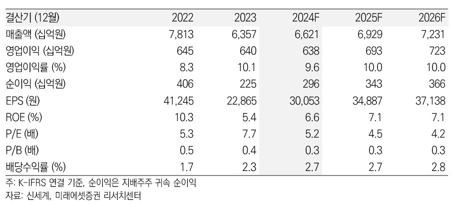신세계의 재무 상황은 안정적임. 2024년 매출액은 4.8조 원, 영업이익은 3,200억 원으로 예상됨. 부채비율은 낮고, ROE는 높은 수준을 유지하고 있음. 매출액과 영업이익 모두 전년 대비 소폭 증가할 것으로 보임.