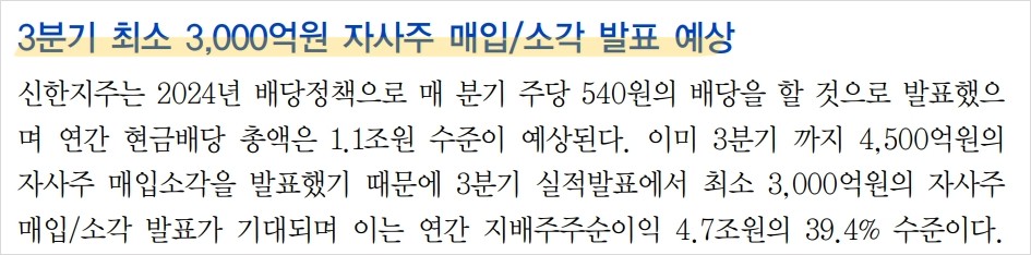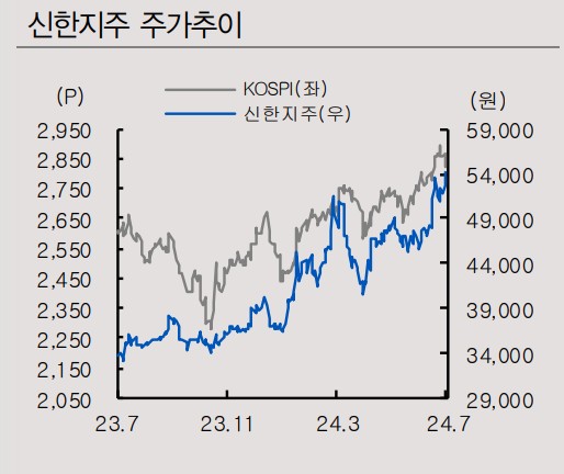 신한지주의 주가는 앞으로 꾸준한 상승세를 보일 것으로 예상됨. 자사주 매입/소각 및 배당 정책은 주주가치 제고에 긍정적인 영향을 미칠 것으로 보임. 2024년 하반기에는 더 큰 실적 개선이 기대됨. 다양한 사업 부문에서의 안정적인 성장은 투자자들에게 신뢰를 줄 수 있으며, 주가 상승의 중요한 요인으로 작용할 것임.