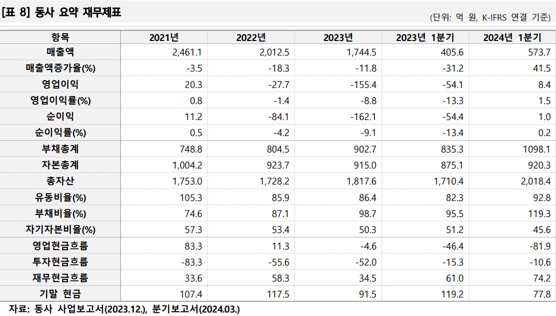 신화인터텍의 재무 상황은 최근 3개년 간 매출 감소세를 보였으나, 2024년 1분기에는 매출이 증가함. 부채비율은 증가하였지만 전반적인 재무구조는 양호한 편임. 이차전지 소재 사업으로의 확장이 기대됨.