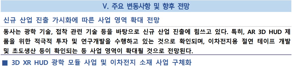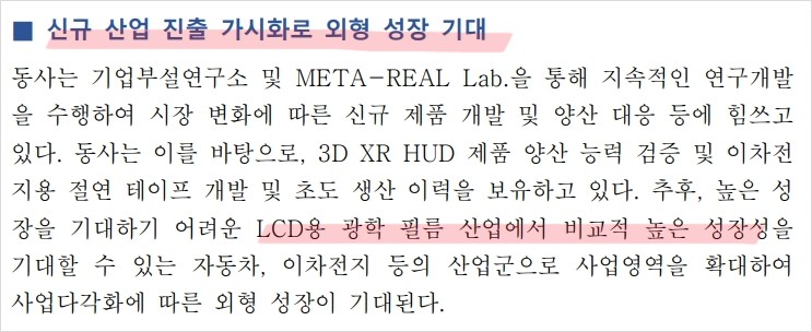 신화인터텍은 디스플레이 광학 필름과 모바일 OLED용 테이프 시장에서 강세를 보이고 있으며, 이차전지 소재 시장으로의 확장을 통해 성장 가능성을 높이고 있음. 연구개발 역량이 뛰어나며, 다양한 고객사와의 협력을 통해 안정적인 매출을 기록하고 있음. 장기적인 성장 가능성이 높은 기업임.