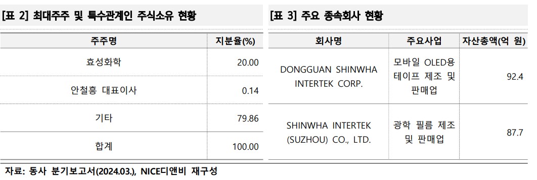 신화인터텍은 디스플레이 광학 필름 전문 제조업체로, 1988년 설립되어 2001년 코스닥에 상장되었음. 주력 제품은 광학 필름, 모바일 및 IT용 테이프 등으로, 최근에는 이차전지 소재 분야로 사업을 확장하고 있음. 대표적인 고객사로는 삼성전자, 삼성디스플레이, BOE, AUO, INNOLUX 등이 있음. 2024년 1분기 매출은 전년 동기 대비 41.5% 증가한 573.7억원을 기록함.