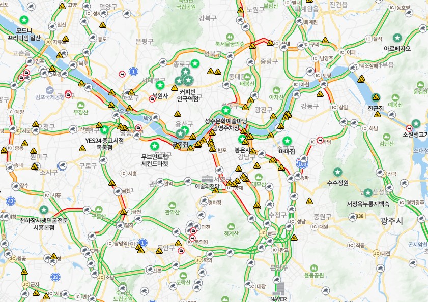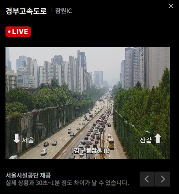 교통상황 CCTV도 네이버지도나 카카오맵에서 볼 수 있습니다. 지도에서 CCTV모양이 있잖아요? 이 친구를 누르면 실시간 CCTV를 볼 수 있습니다. 너무 재미있죠? 이거 북한에서 이용하는건 아닌지 몰라요 ㅋㅋ 군용차 친구들도 다 민간도로 이용하는데 말이죠.