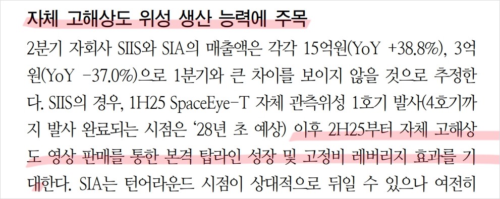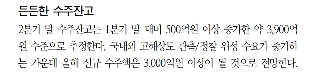 쎄트렉아이는 최근 고해상도 관측/정찰 위성 수요 증가로 인해 안정적인 수주잔고를 확보하고 있음. 2024년 1분기 말 수주잔고는 약 3,900억 원으로 증가했으며, 연간 신규 수주액은 3,000억 원 이상이 될 것으로 전망됨. 주요 고객으로는 국내외 정부 기관과 상업 위성 운영 업체들이 있음. 자회사 SIIS와 SIA의 매출도 안정적으로 유지되고 있으며, SpaceEye-T 위성 발사 후 고해상도 영상 판매를 통한 본격적인 매출 성장 기대됨. 향후 자체 고해상도 위성 생산 능력을 통한 고수익성 사업 참여가 기대됨.