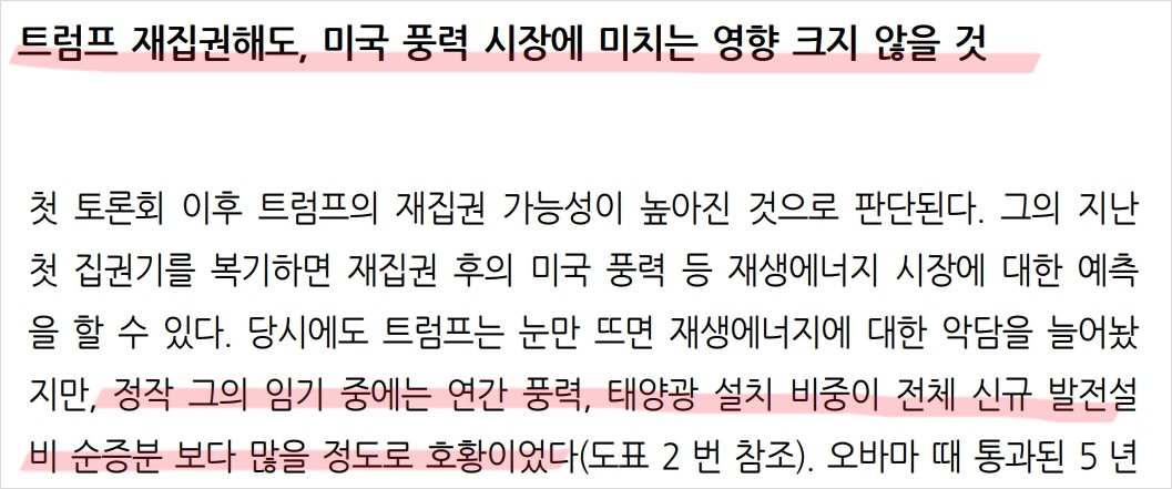 씨에스윈드는 장기적으로 성장할 수밖에 없는 기업인데, 트럼프가 복병이라고 생각함. 따지고 보면 복병은 아닌데 투자는 심리전이니까 말이지. 트럼프가 당선될 가능성이 높아지면서 친환경주들 주가도 떡락중. 근데 이걸 기회로 삼을수도? 전문가 리포트 보면 고개가 끄덕끄덕.