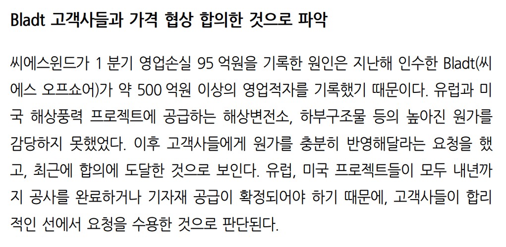 씨에스윈드는 안정적인 실적과 지속적인 성장 이어가고 있는 기업. Bladt 판가 인상과 영국 해상풍력 확대가 긍정적인 요인으로 작용 중. 재무 상황도 양호하며, 향후 주가 전망도 밝음. 투자의 판단은 본인의 몫이지만, 씨에스윈드는 장기적인 투자 관점에서 긍정적인 선택 될 수 있음.