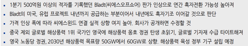 씨에스윈드는 글로벌 풍력 타워 제조업체로, 주요 고객사는 Vestas, Siemens, GE 등임. 최근 Bladt 판가 인상으로 연간 흑자전환 가능성이 높아짐. 미국과 유럽 프로젝트를 통해 내년까지도 안정적인 실적을 기대할 수 있음. 중국을 제외한 글로벌 해상풍력 1위 국가인 영국의 해상풍력 확대 정책은 씨에스윈드에게 큰 호재임. 영국 노동당 집권 시 해상풍력 목표량을 60GW로 상향할 예정이며, 이는 씨에스윈드의 매출 증가에 기여할 것임.
