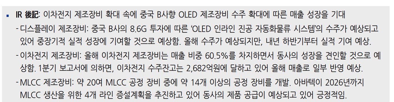 아바코는 최근 중국 B사의 8.6G OLED 제조장비 수주가 기대되며, 이로 인해 중장기적 실적 성장이 예상됨. 올해 수주가 예상되지만 본격적인 매출 기여는 내년 하반기부터 이루어질 것으로 보임. 이차전지 제조장비 부문에서는 매출 비중이 60.5%를 차지하며, 수주잔고는 2,682억원에 달함. MLCC 제조장비 부문에서도 주요 고객인 아바텍이 2026년까지 생산 라인을 증설할 계획이 있어 긍정적임. 특히 이차전지 제조장비 부문에서의 매출 성장이 두드러짐.