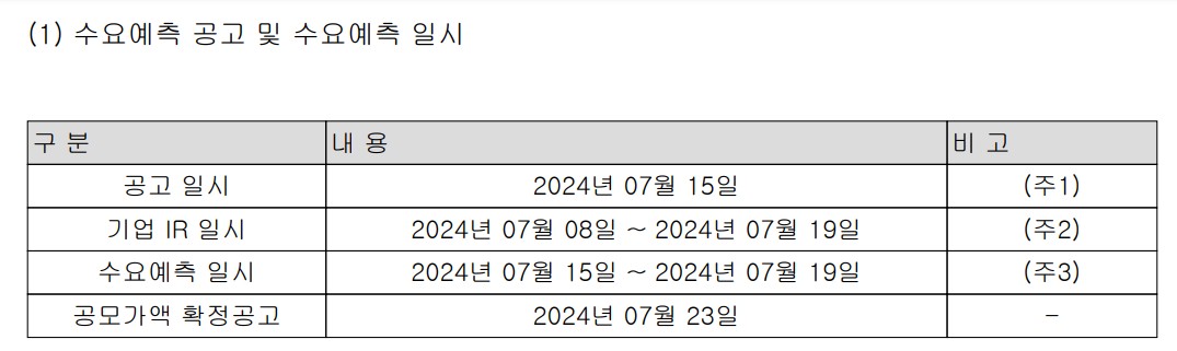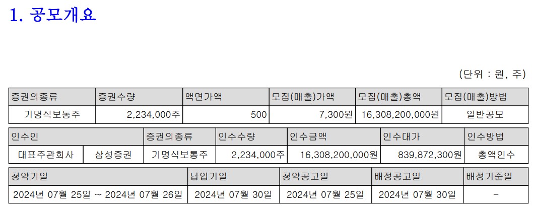 아이빔테크놀로지의 공모 개요는 다음과 같음. 이번 공모를 통해 총 2,234,000주의 주식을 발행하며, 희망 공모가는 7,300원에서 8,500원 사이로 설정됨. 상장 주관사는 삼성증권이며, 수요 예측은 2024년 7월 25일부터 7월 26일까지, 청약 기일은 7월 30일로 진행될 예정임. 배정 및 환불일과 납입 기일은 2024년 8월 12일로 계획됨.