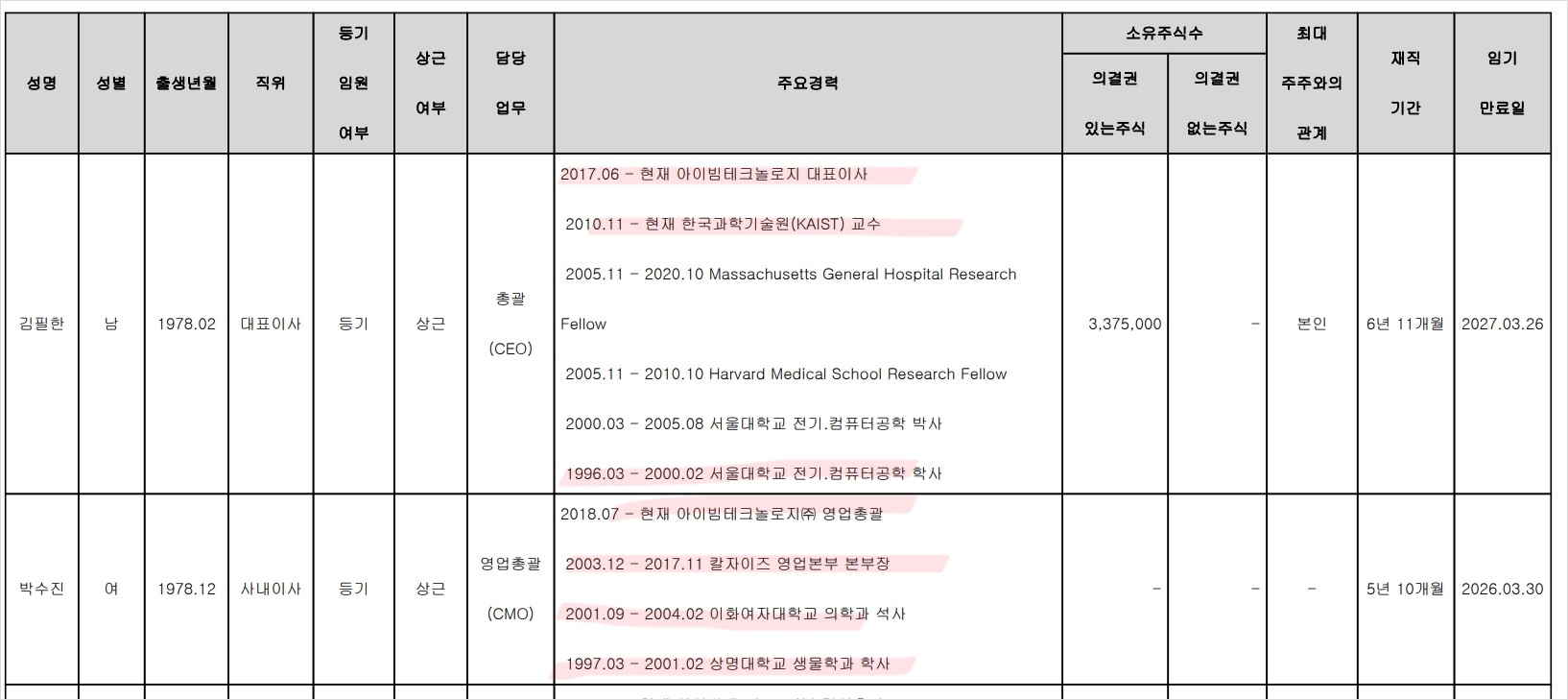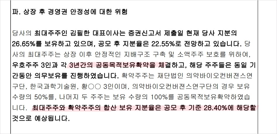✅ 상장 이후 대표이사 + 우호주주3인과 각 3년간 공동목적보유확약을 체결함. 먹튀하려는 바이오기업들은 이런거 안하는데 여기는 3년 간 의무보유확약을 했으니 먹튀 걱정은 당분간 안해도 될 듯. 단, 제대로 된 성장세가 나올 때까지 최소 2~3년은 걸린다는 해석도 가능하니 유의할 것.