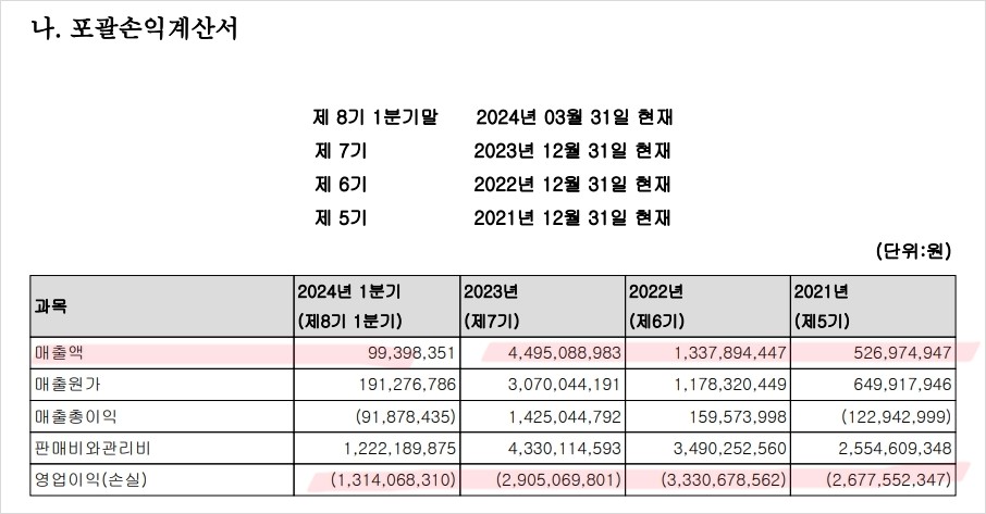 아이빔테크놀로지는 2024년 1분기 매출 99백만원, 영업손실 1,314백만원, 당기순손실 1,257백만원을 기록함. 이는 전년도 같은 기간에 비해 매출은 증가했으나, 영업손실과 순손실은 지속되고 있는 상황임. 이러한 재무 상태는 지속적인 연구개발 투자와 초기 시장 진입 비용으로 인한 것으로 보임.