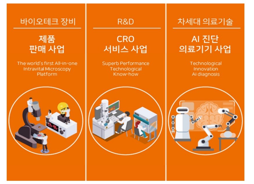 아이빔테 크놀로지는 혁신적인 생체현미경 기술 바탕으로 다양한 생체 영상 솔루션 제공함. 주요 제품으로는 초고속 레이저 스캐닝 생체현미경이 있으며, 이는 살아있는 생체 내부의 조직과 세포를 실시간으로 관찰할 수 있는 기술임. 이 기술은 기존의 MRI나 CT로는 불가능했던 세포 단위의 세밀한 관찰을 가능하게 함.