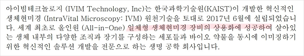 아이빔테크놀로지는 2017년에 설립된 생명공학 회사로, 세계 최초로 올인원 일체형 생체현미경 장비 상용화에 성공함. 이 회사는 혁신적인 생체현미경 기술 바탕으로 살아있는 생체 내부의 다양한 조직과 장기를 구성하는 세포들과 바이오 약물을 동시에 이미징할 수 있는 솔루션 제공함. 아이빔테크놀로는 뛰어난 기술력으로 글로벌 시장에서도 경쟁력을 갖추고 있음.