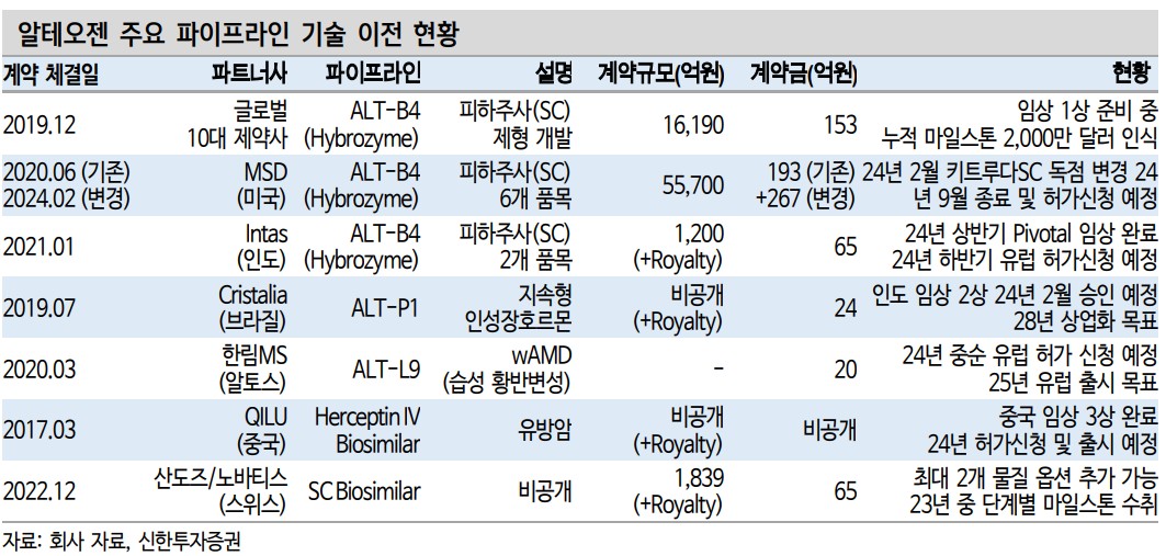 알테오젠은 현재 글로벌 파트너사와의 협력 강화로 인해 긍정적인 실적을 기대할 수 있음. 테르가제의 승인과 ADC SC 기술이전의 성공적인 진행은 향후 매출 증가에 크게 기여할 것으로 보임. 또한, 피하주사 기술의 혁신적인 발전과 더불어, 글로벌 시장에서의 경쟁력을 강화하고 있음.