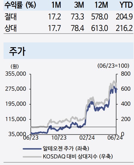 알테오젠 주가는 긍정적인 실적 발표와 신제품 출시 소식에 따라 상승할 가능성이 높음. 글로벌 시장 진출이 성공적으로 이루어진다면 추가적인 주가 상승이 기대됨. 현재 주가는 279,000원이며, 목표 주가는 300,000원으로 설정됨.