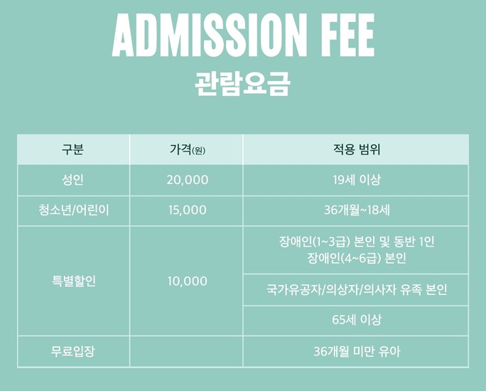 - 가격: 성인 20,000원, 청소년/어린이 15000원, 특별할인 10000