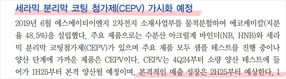 에스에이티이엔지는 2023년 2차전지 소재사업부를 물적분할하여 에코케미칼을 설립함. 현재 세라믹 분리막 코팅 첨가제(CEPV)의 샘플 테스트를 진행 중이며, 2025년부터 본격 양산 예정. 1공장 연간 생산 능력은 200억원 규모이며, 2공장 착공 계획도 있음. 디스플레이 본업의 수주 금액은 2022년 260억원에서 2023년 108억원으로 감소했으나, 2025년부터 CEPV 양산을 통한 매출 성장이 기대됨.