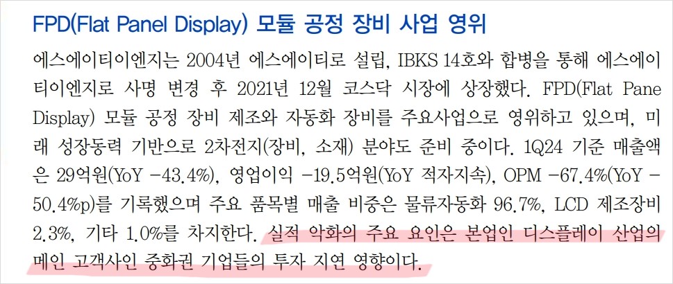 에스에이티이엔지는 FPD 모듈 공정 장비와 자동화 장비를 주요 사업으로 영위하며, 2차전지 분야에서도 성장동력을 마련 중임. 2024년 1분기 매출액은 29억원, 영업이익은 -19.5억원을 기록. 실적 악화의 주요 요인은 디스플레이 산업의 주요 고객사인 중화권 기업들의 투자 지연임. 에코케미칼과의 협력을 통해 세라믹 분리막 코팅 첨가제(CEPV)를 개발 중이며, 2025년부터 본격적인 양산이 기대됨.