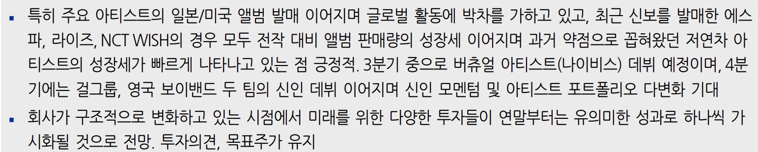 에스엠의 최근 주요 이슈는 다음과 같음. 주요 아티스트들의 일본 및 미국 앨범 발매가 이어지면서 글로벌 활동에 박차를 가하고 있음. 특히 에스파, 라이즈, NCT WISH 등의 아티스트가 전작 대비 앨범 판매량 성장세를 이어가며 긍정적인 평가를 받고 있음. 3분기에는 버츄얼 아티스트 나이비스의 데뷔가 예정되어 있으며, 4분기에는 새로운 걸그룹과 영국 보이밴드의 신인 데뷔가 기대됨. 이로 인해 에스엠의 아티스트 포트폴리오가 더욱 다양해질 것으로 보임.