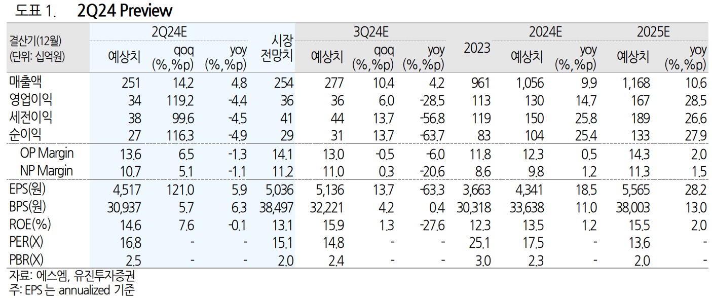 A. 에스엠은 주요 아티스트들의 글로벌 활동 증가와 신인 아티스트의 데뷔로 인해 주가 상승 가능성이 큼. 2024년 2분기 실적 호조와 함께 주가 상승 기대감이 높아짐.