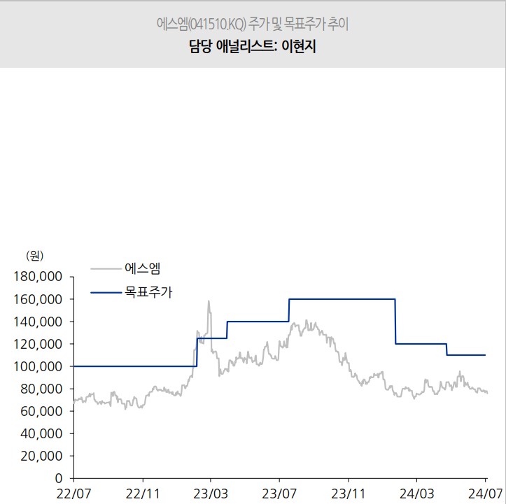 에스엠의 12개월 목표주가는 11만원으로 설정됨. 이는 현재 주가 대비 상당한 상승 여력을 의미함. 개인적으로도 11만원 이상을 목표로 삼아볼 만함.