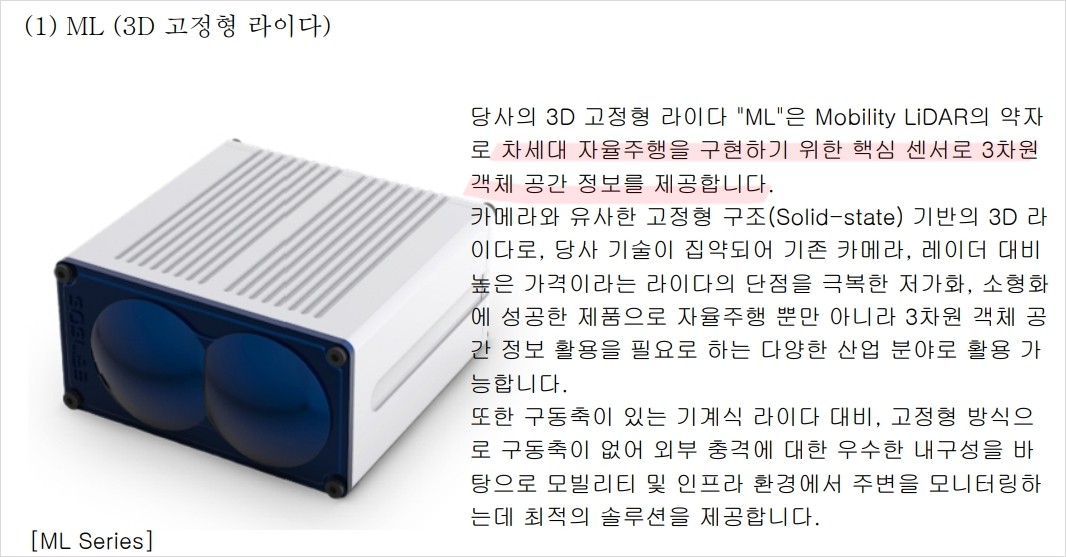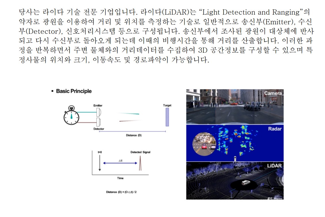 고객 맞춤형 솔루션을 제공하며 다양한 산업 분야에서 수요를 충족시키고 있음. 주요 제품과 서비스는 라이다 센서, 자율주행 솔루션, 스마트 시티 응용 등으로 다양함.