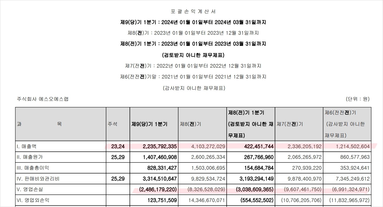 이러한 재무 성장은 주로 신제품 출시와 해외 시장 확장에 기인함. 특히, 유럽 및 북미 시장에서의 매출 증가가 두드러졌음. 향후 에스오에스랩은 지속적인 연구개발 투자와 글로벌 시장 확대를 통해 더욱 성장할 것으로 기대됨.