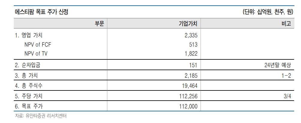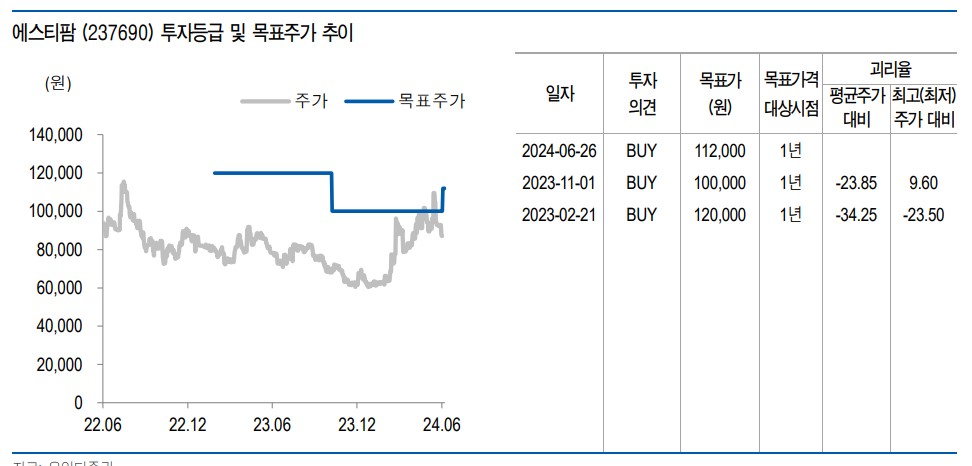 에스티팜의 목표 주가는 112,000원으로 설정됨. 이는 현재 주가 대비 약 29% 상승 여력을 의미함. 안정적인 재무 구조와 지속적인 매출 성장이 이를 뒷받침함.