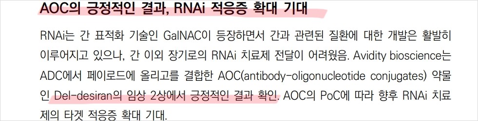 에스티팜의 최근 이슈로는 상업화 파이프라인 확대와 RNAi 치료제의 적응증 확대가 있음. 라이텔로와 렉비오의 매출 성장이 두드러지며, RNAi 치료제는 간 이외 장기로의 전달이 어려운 상황에서 AOC 기술로 이를 극복하고 있음. 에스티팜은 AOC 기술의 PoC 결과에 따라 RNAi 치료제의 타겟 적응증을 확대할 계획임. 향후 RNAi 치료제 시장에서의 성장 가능성이 높음. 상업화 파이프라인의 확대와 RNAi 치료제의 발전이 주요 성장 동력임.