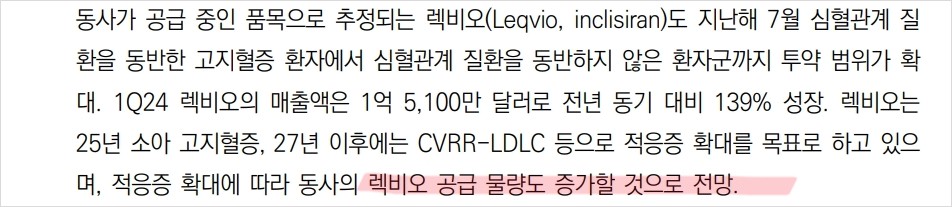 에스티팜의 주요 상업화 파이프라인은 라이텔로와 렉비오이며, 두 제품 모두 FDA 승인을 받아 시장에서 주목받고 있음. 라이텔로는 6월에 MDS 적응증에 대해 FDA 승인을 받았으며, 연말까지 추가 승인이 예상됨. 렉비오는 심혈관계 질환을 동반한 고지혈증 환자에게 사용되며, 매출액은 전년 대비 139% 성장하여 1억 5,100만 달러를 기록함. 에스티팜은 RNAi 치료제 시장에서 큰 성장이 기대됨. 올리고뉴클레오타이드 API 매출도 증가하고 있어 실적 개선이 예상됨. 상업화 파이프라인의 확대가 주요 성장 요인임.