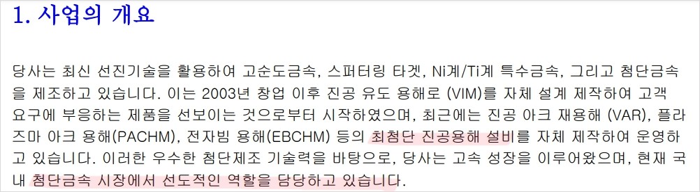 에이치브이엠은 첨단금속 제조업체로, 다양한 산업 분야에 사용되는 고순도 금속과 특수 합금 제품을 생산함. 이번 공모를 통해 조달한 자금은 주로 연구개발비와 운영자금으로 사용될 예정. 투자자들은 본 공모의 주요 내용을 반드시 확인해야 함.