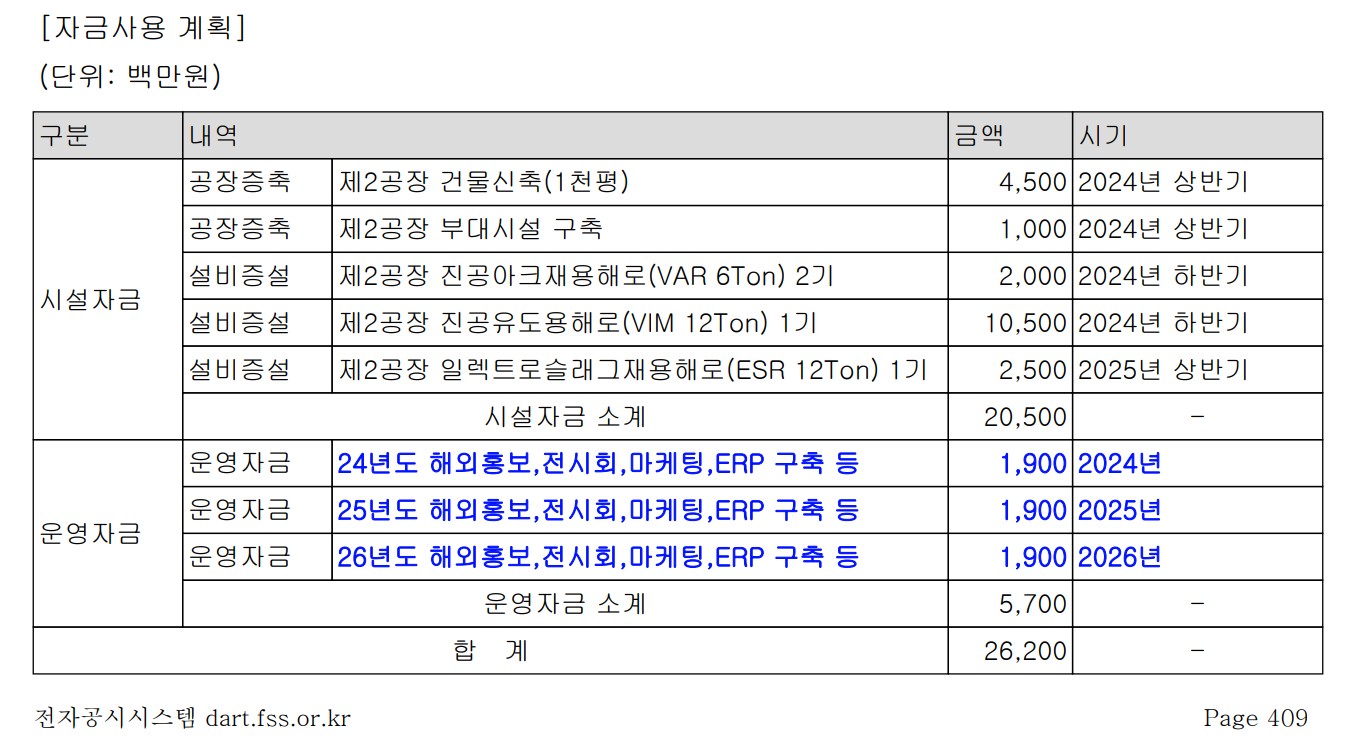 공모금액 사용처를 보면 시설자금에 대부분 사용되는데 딱 봐도 공장 신축, 설비증설에 엄청나게 투자됨. 즉, 앞으로 생산량이 많아질 거라는 신호이며 매출액과 영업이익이 크게 늘 것이라는 것이지. 2024년 하반기에 설비투자가 완료되면 2025년부터 날라갈 거 같음.