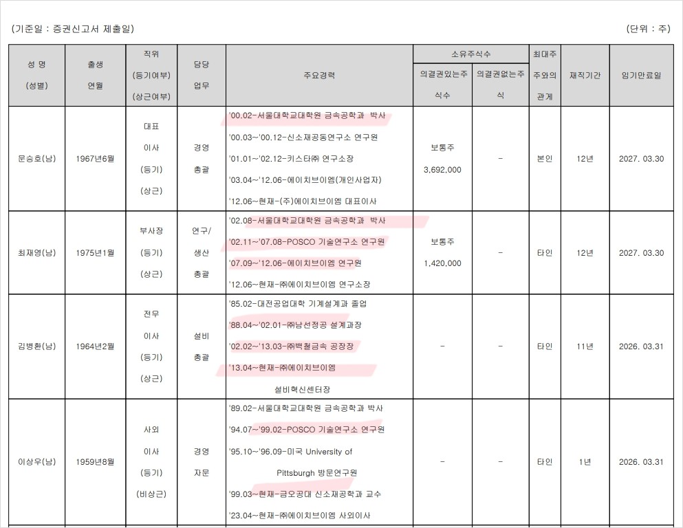 에이치브이엠은 첨단금속 산업에 속해 다양한 사업위험에 노출됨. 시장 변동성이 크고, 신제품 개발 실패 시 큰 손실을 입을 수 있음. 또한, 경쟁이 심화되면 시장 점유율이 감소할 위험도 존재함. 투자자는 이러한 사업위험을 충분히 인지하고 투자 결정을 내려야 함.