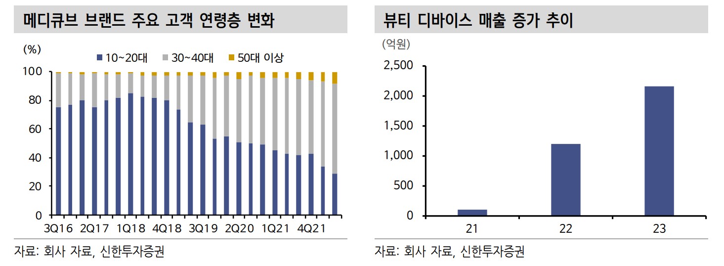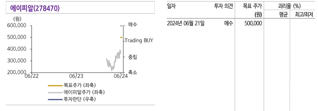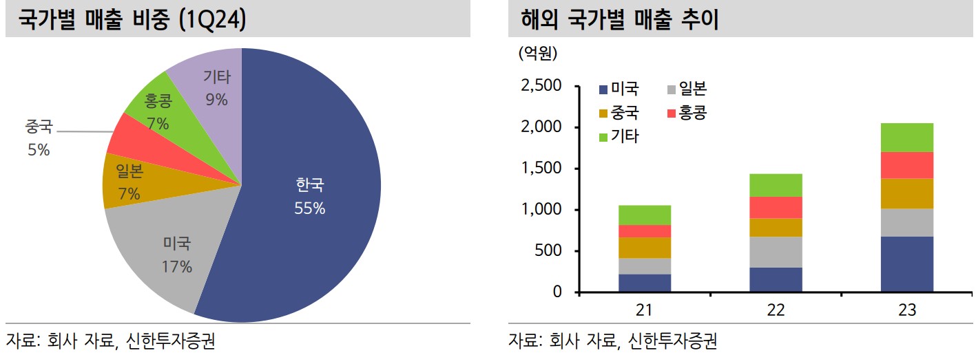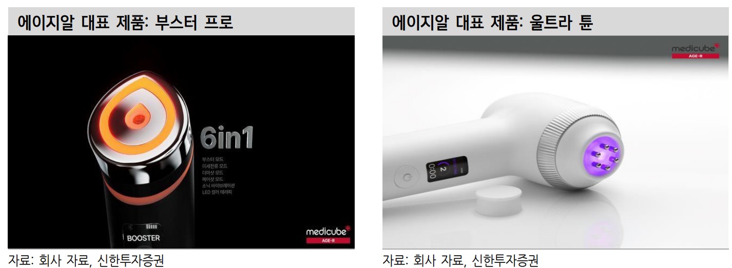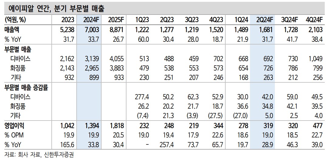 에이피알은 최근 홈뷰티 디바이스와 화장품 매출이 고르게 증가하고 있음. 2023년 매출액은 5,238억 원, 영업이익은 1,042억 원을 기록했으며, 2024년 예상 매출액은 7,003억 원, 영업이익은 1,394억 원으로 전망됨. 특히 미국 아마존에서 메디큐브와 에이프릴스킨 브랜드 제품이 Top 100에 다수 포함되면서 해외 매출 성장이 기대됨.