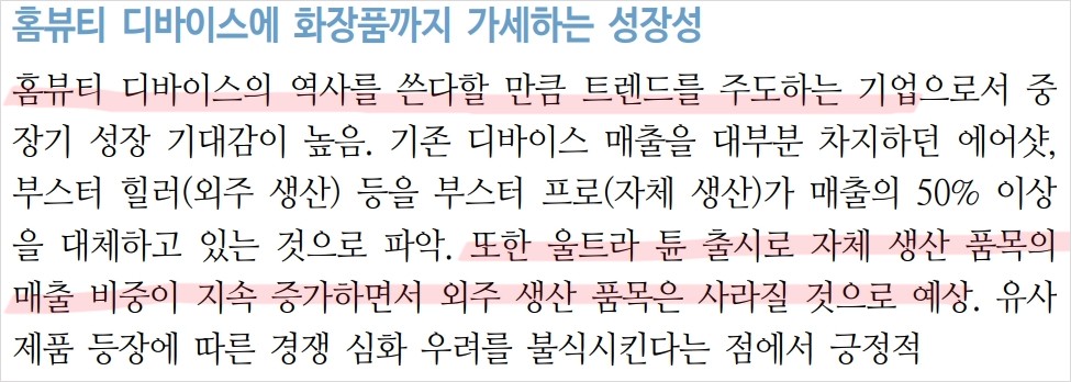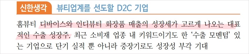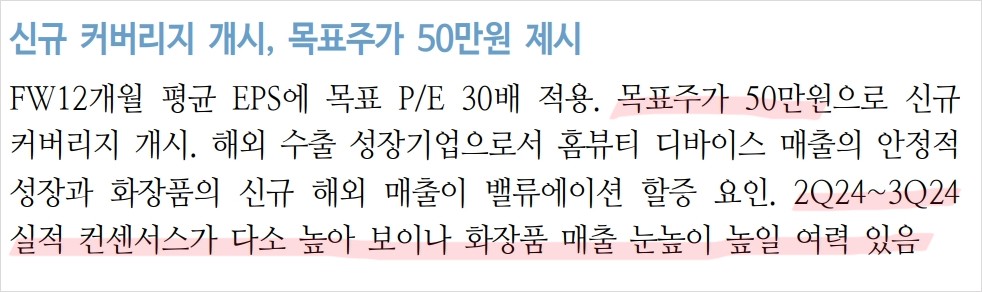 목표주가는 500,000원으로 제시됨. 이는 홈뷰티 디바이스와 화장품 매출 성장 및 해외 시장 확대를 고려한 수치임.