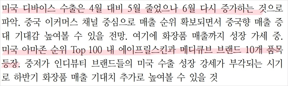 에이피알은 최근 홈뷰티 디바이스의 성공적인 판매와 함께 화장품 부문에서도 성장세를 보이고 있음. 특히 미국 아마존에서 메디큐브와 에이프릴스킨 제품이 인기를 끌면서 매출이 증가하고 있음. 또한, 자사몰을 통한 매출 비중이 높아 영업마진이 높은 편임. 미국과 중국 시장에서의 성과가 주목받고 있음.