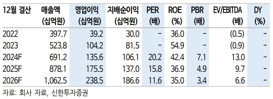 에이피알의 2023년 매출액은 5,238억원, 영업이익은 1,042억원을 기록함. 2024년과 2025년에는 각각 매출액 6,912억원, 8,781억원과 영업이익 1,356억원, 1,755억원을 달성할 것으로 예상됨. 부채비율은 2023년 45.9%에서 2024년 37.7%, 2025년 32.0%로 감소할 전망. PER은 2023년 20.2배에서 2024년 15.8배로 개선될 것으로 보임.