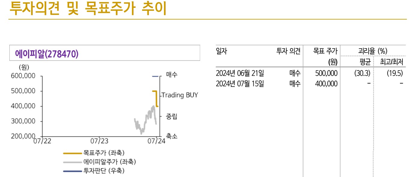 에이피알은 화장품 및 홈뷰티 디바이스 시장에서 강력한 입지를 유지하며, 유럽과 미국 시장에서의 확장 전략이 주효하고 있음. 하반기 실적 개선 기대감과 수출 성장세 유지가 주가에 긍정적인 영향을 줄 것으로 전망됨. 목표 주가는 400,000원으로 설정됨. 투자 판단은 본인의 판단과 책임하에 이루어져야 함.