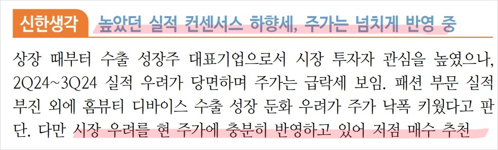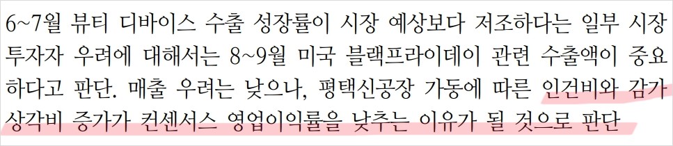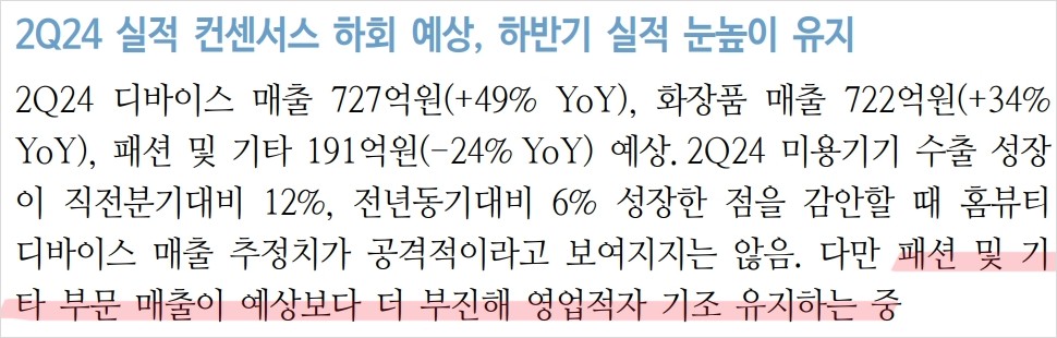에이피알은 최근 실적 컨센서스를 하회하는 2분기 실적이 예상되지만, 하반기 실적에 대한 기대감이 높음. 홈뷰티 디바이스와 화장품 수출이 하반기에도 꾸준히 성장할 것으로 보이며, 유럽 법인의 B2B 매출 증가가 예상됨. 또한, 미국 블랙프라이데이 시즌에 맞춰 수출액 증가가 기대되며, 이는 주가에 긍정적인 영향을 줄 수 있음.
