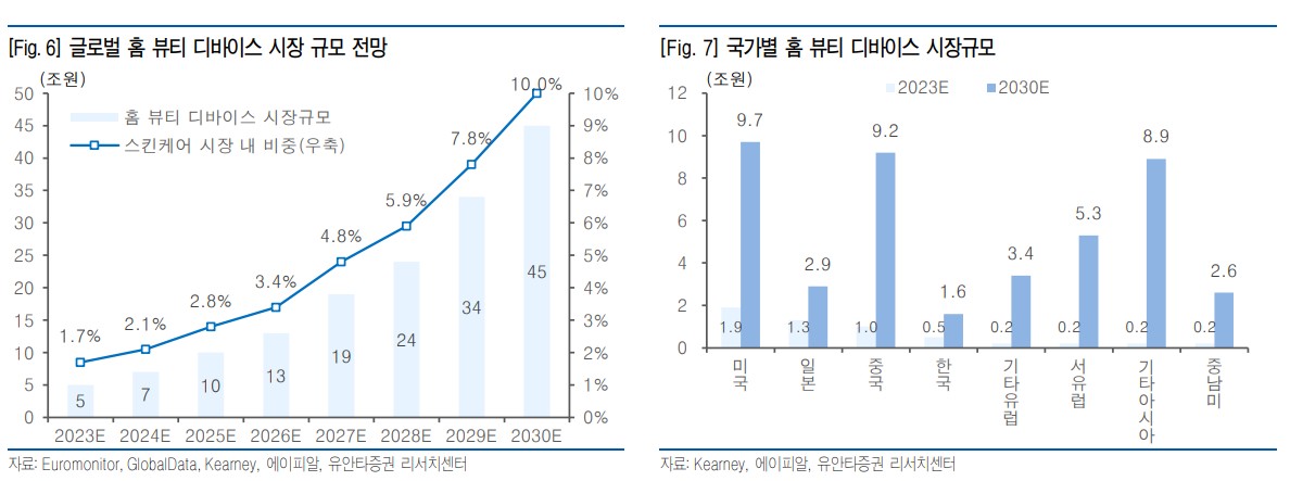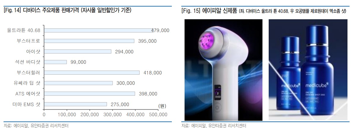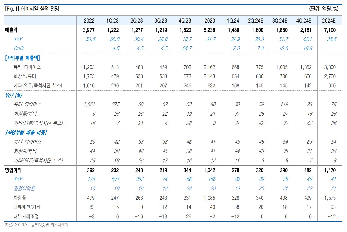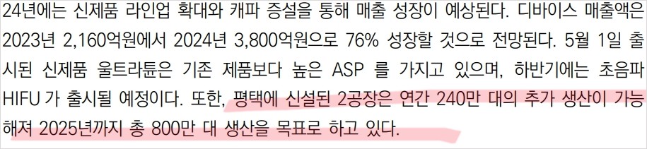 에이피알은 메디큐브 화장품과 디바이스 부문에서 동반 글로벌 성장을 하고 있음. 국내 홈뷰티 디바이스 시장에서 1위를 차지하고 있으며, 2023년 기준 시장 점유율은 약 32%로 추정됨. 에이피알은 기술개발 및 공정 최적화를 통해 원가 경쟁력을 확보하고 있음. 2024년에는 신제품 라인업 확대와 캐파 증설을 통해 매출 성장이 예상됨. 디바이스 매출액은 2023년 2,160억 원에서 2024년 3,800억 원으로 76% 성장할 것으로 전망됨. 5월 1일 출시된 신제품 울트라튠은 기존 제품보다 높은 ASP를 가지고 있으며, 하반기에는 초음파 HIFU가 출시될 예정임.