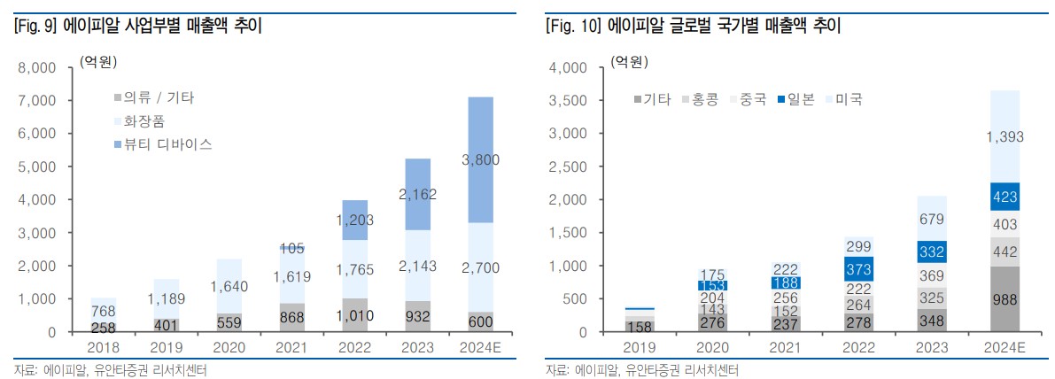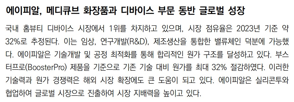 에이피알은 메디큐브 화장품과 디바이스 부문에서 동반 글로벌 성장을 하고 있음. 국내 홈뷰티 디바이스 시장에서 1위를 차지하고 있으며, 2023년 기준 시장 점유율은 약 32%로 추정됨. 에이피알은 기술개발 및 공정 최적화를 통해 원가 경쟁력을 확보하고 있음. 2024년에는 신제품 라인업 확대와 캐파 증설을 통해 매출 성장이 예상됨. 디바이스 매출액은 2023년 2,160억 원에서 2024년 3,800억 원으로 76% 성장할 것으로 전망됨. 5월 1일 출시된 신제품 울트라튠은 기존 제품보다 높은 ASP를 가지고 있으며, 하반기에는 초음파 HIFU가 출시될 예정임.