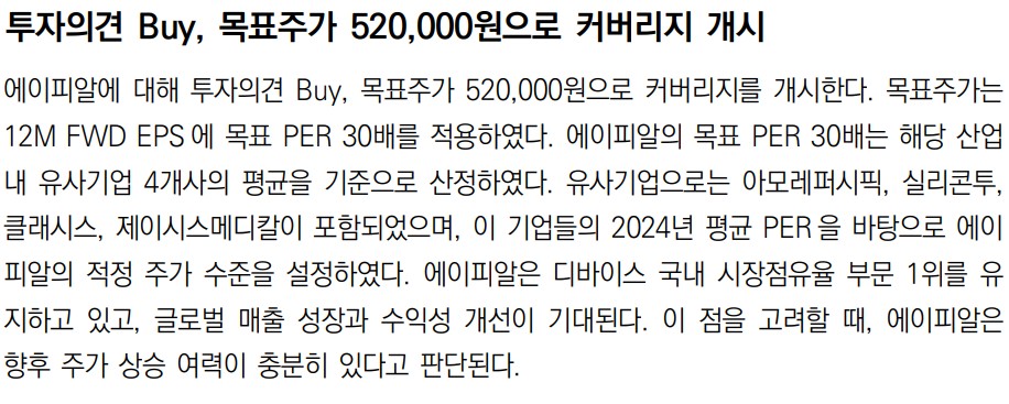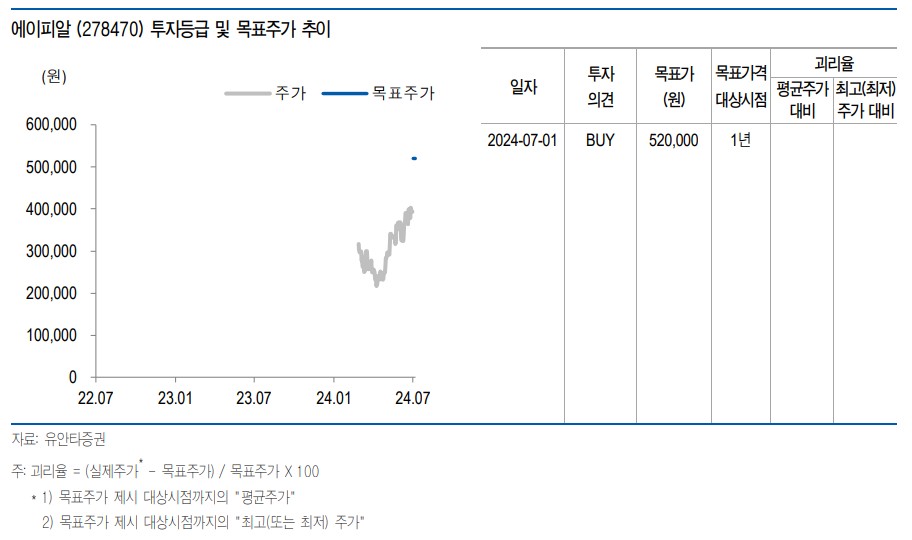 에이피알의 목표주가는 520,000원으로 제시됨. 이는 현재 주가 대비 32%의 상승 여력을 가지고 있으며, 다양한 사업 부문의 성장과 수익성 개선 노력이 이를 뒷받침하고 있음. 에이피알의 지속적인 성장은 주가 상승의 주요 원동력이 될 것임.