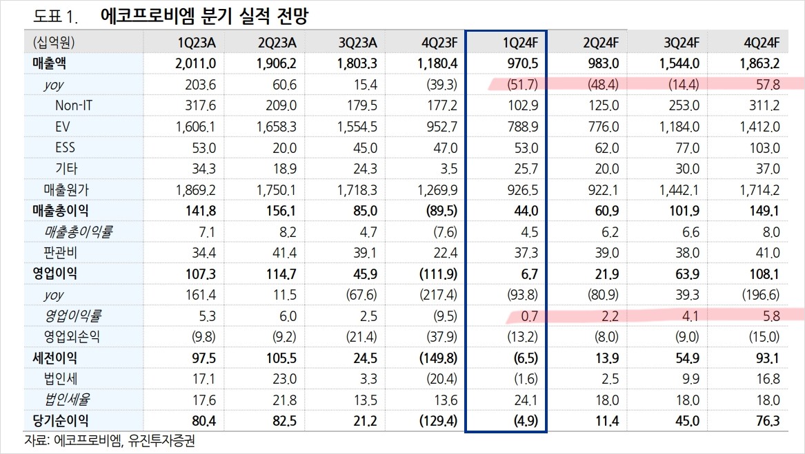 양극재는 에코프로그룹 뿐만 아니라 포스코 그룹과 엘앤에프 등 많은 기업들이 투자를 했습니다. 공급은 당연히 늘었구요.공급은 크게 늘었는데 수요가 맞춰서 늘지를 않으니 실적이 좋아질 수가 없습니다. 에코프로비엠의 2024년 1분기 실적은 처참합니다. 이게 호전될까요? 호전되겠죠. 단, 주가가 높아질 정도로 크게 호전되지는 않을겁니다. 왜냐구요?