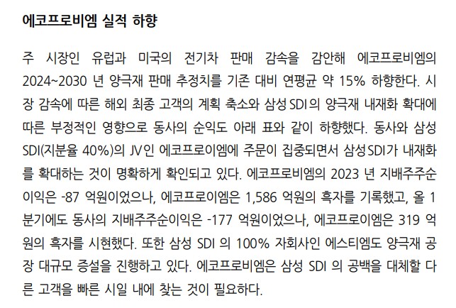 에코프로비엠은 최근 유럽과 미국의 전기차 시장 정책 후퇴로 어려움을 겪고 있지만, 여전히 중요한 시장에서의 성장 가능성을 보유하고 있음. 특히, 삼성SDI와의 협력 강화를 통해 새로운 고객을 확보하려는 노력이 주목받고 있음. 삼성SDI의 자회사인 에스티엠의 대규모 양극재 공장 증설은 에코프로비엠의 매출 확대에 긍정적인 영향을 미칠 수 있음. 또한, 에코프로이엠과의 JV(합작법인)를 통해 지속적인 수익 창출이 기대됨.
