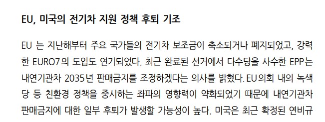 에코프로비엠은 최근 유럽과 미국의 전기차 보조금 축소 및 정책 후퇴로 인해 매출 성장에 어려움을 겪고 있음. 특히, 미국의 연비 규제가 완화됨에 따라 대형 전기차 도입 계획이 늦춰질 가능성이 있음. 이로 인해 에코프로비엠의 양극재 판매량이 예상보다 낮아질 것으로 전망됨. 그러나, 에코프로비엠은 신규 고객 확보와 내부 효율성 개선을 통해 이러한 어려움을 극복하려는 노력을 기울이고 있음.